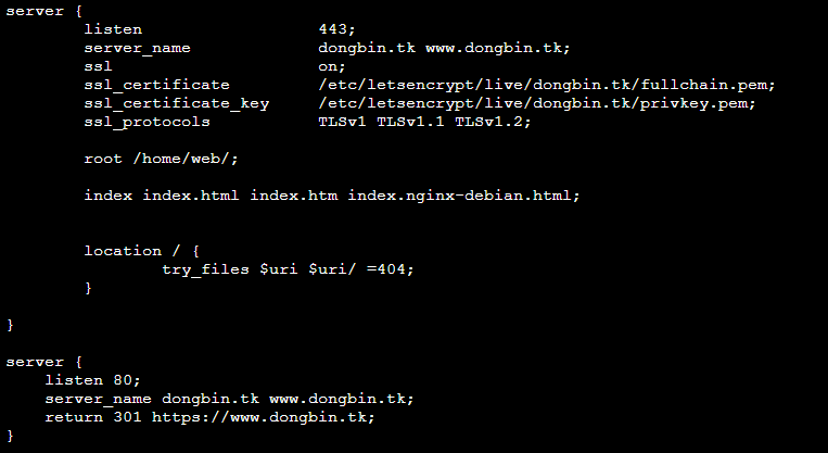 따라서 /etc/nginx/site-available/default의 server 항목을 다시 수정합니다. 총 2개의 server 항목이 존재할 수 있도록 만듭니다. 아래 코드와 같이 기본적으로 443 포트를 사용하도록 하고, 추가적으로 80번 포트로의 접속은 https로 리다이렉트 시키도록 작업하면 됩니다.