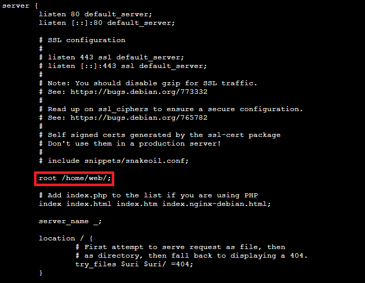 nginx는 처음 설치했을 때 기본적인 환경 설정 파일의 경로가 /etc/nginx/sites-available/default입니다. 따라서 웹 서버의 루트 디렉토리 변경 등의 작업이 필요하다면, 이 경로에 들어가시면 됩니다. 저는 root 폴더의 디렉토리(Directory)를 변경해보겠습니다. 저는 /home/web으로 변경했습니다.