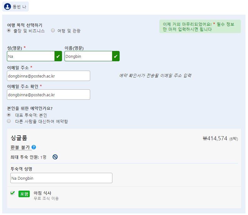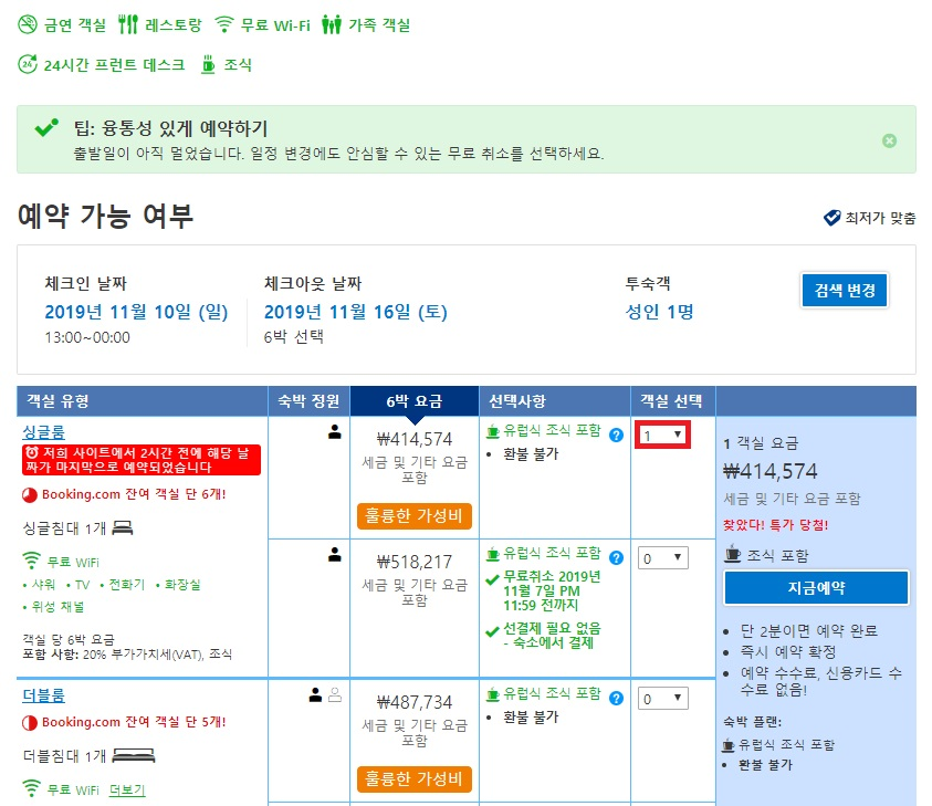 기본적으로 무료 Wi-Fi와 조식을 포함하고 있는지 확인해주셔야 합니다. 저는 와이파이만 잘 된다면, 큰 문제가 없기 때문에 이렇게 진행했습니다. 또한 다음과 같이 무료 취소가 가능한 옵션은 가격이 더 비싼 것을 알 수 있습니다. 저는 일정이 확정되어 있기 때문에, 취소할 일이 없어 다음과 같이 저렴한 가격의 옵션으로 예약을 진행했습니다.