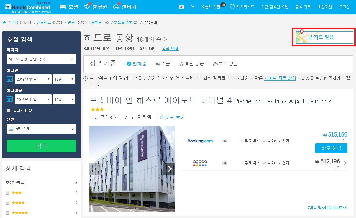 웹 사이트에 접속하면 여행지와 체크인(Check-In) 및 체크아웃(Check-Out) 기간을 입력하여 호텔을 찾을 수 있습니다. 저는 히드로 공항 근처에서 11월 10일부터 11월 16일까지 묶을 예정이기 때문에 다음과 같이 검색했습니다.