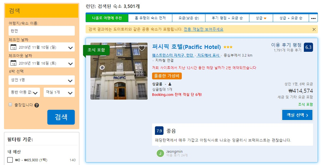 저는 다음과 같이 큰 지도를 보면서, 원하는 위치에 있는 숙박업소 중에서 가격이 저렴한 편인 하나의 호텔을 선택했습니다. (위치 및 가격과 별점을 한 눈에 보여줍니다.) 가격이 상당히 저렴한 편인데요. 별점은 그럭저럭 나쁘지 않기 때문에 여기로 선택했습니다.