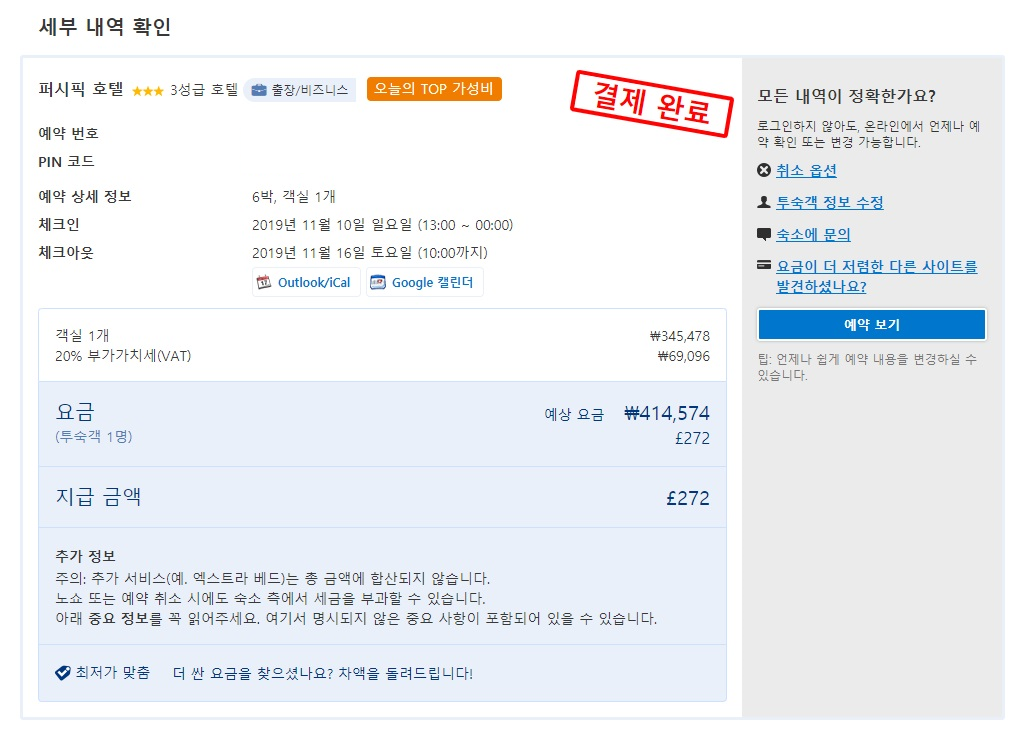 이후에 다음과 같이 세부 내역을 확인할 수 있습니다. [예약 번호] 및 [PIN 코드] 정보 또한 같이 출력이 되는데요. 이 정보는 예약 정보 수정 및 취소와 관련하여 중요한 정보가 될 수 있기 때문에 스크린 샷에서는 해당 내용을 지웠습니다.