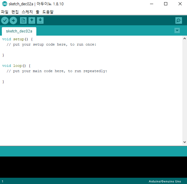 설치가 완료된 이후에 아두이노(Arduino) IDE를 실행해 보면, 다음과 같이 소스코드 에디터(Editor) 화면을 볼 수 있습니다.