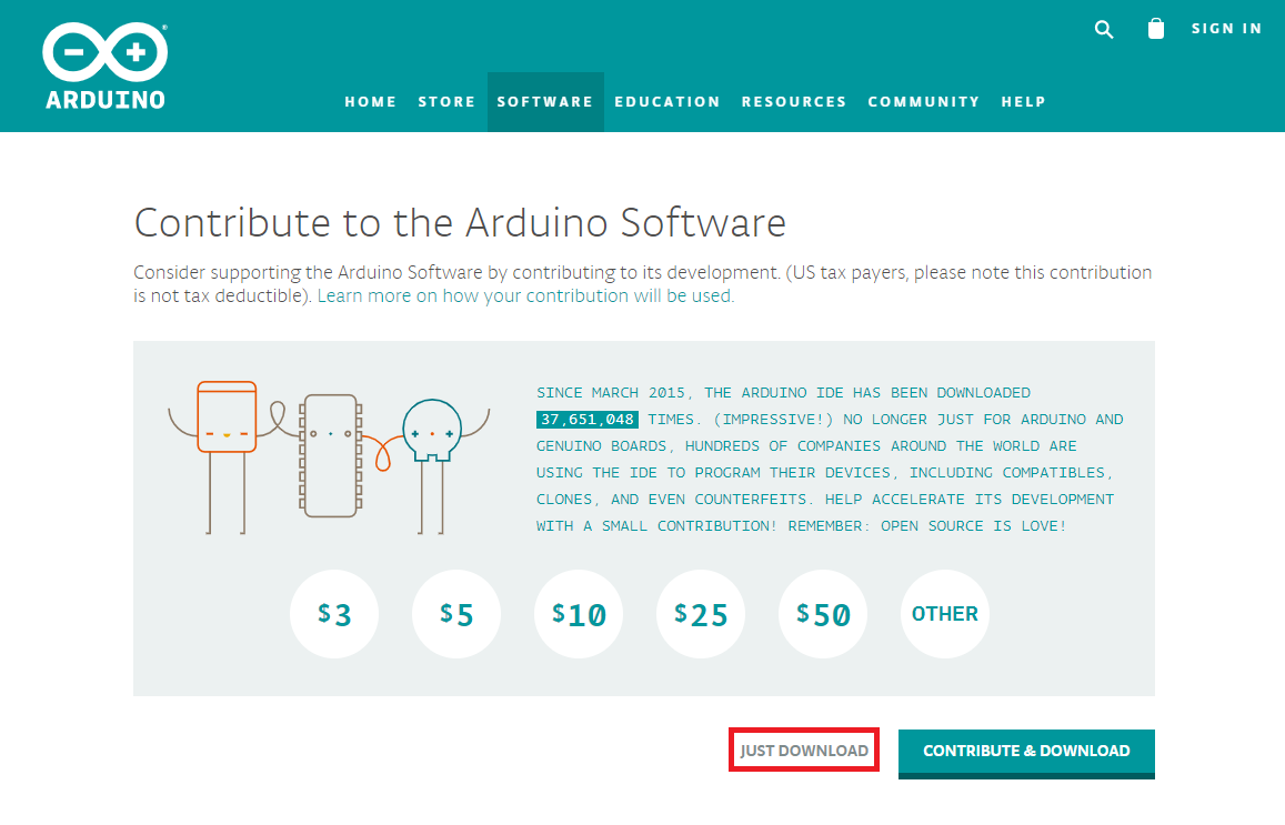 그러면 Arduino Software에 기부(Donation)을 할 것인지 물어봅니다. 여기에서 [JUST DOWNLOAD] 버튼을 누르면 바로 다운로드를 받을 수 있습니다.
