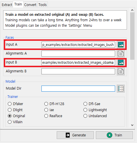 이제 지난 시간에 추출했던 이미지를 가지고 학습을 진행해보자. Input A는 Source이며, Input B는 Target이 된다. 다시 말해 Source 동영상의 얼굴 부분에 Target(피해자) 동영상에 존재하는 사람의 얼굴 정체성(Identity)를 삽입하는 것이다. 즉, Input A에 Input B의 얼굴이 삽입된다. 예를 들어