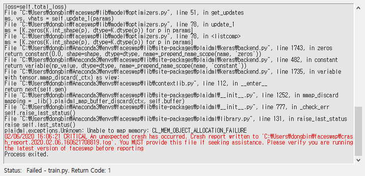 원래는 학습(Training)이 정상적으로 진행이 되며 모델이 학습됨에 따라서 Face Swapping이 얼마나 잘 되는지 [Preview]에서 보인다. 하지만 저자의 경우 AMD 그래픽 카드를 가지고 있어 호환 문제로 다음과 같은 크래시(Crash)가 발생하였다.