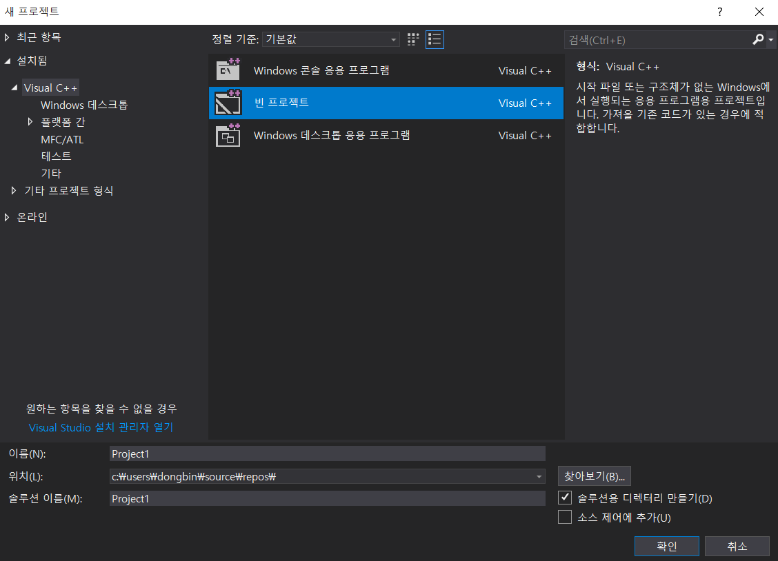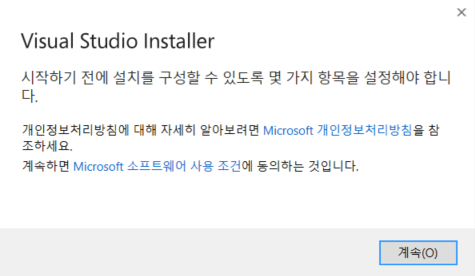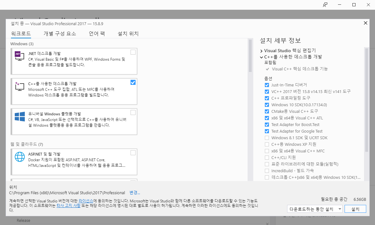 여기에서 자신이 원하는 워크로드를 선택하여 설치하시면 됩니다. 저는 C++ 개발환경을 설치했습니다.