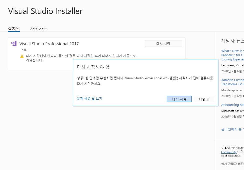 설치 완료 이후에는 재시작하면 됩니다.