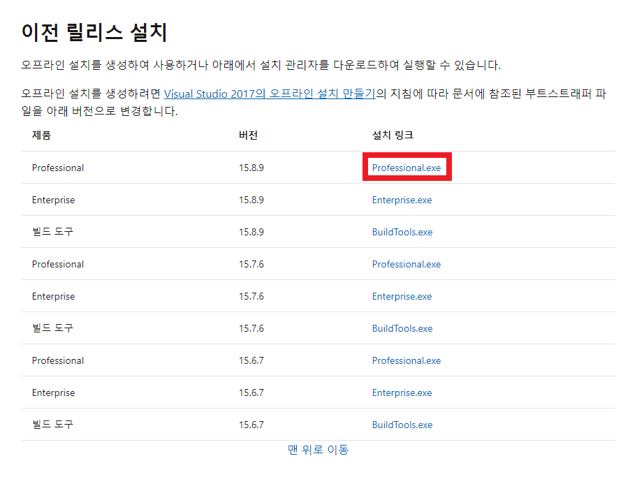 [이전 릴리스 설치] 부분에서 원하는 버전의 설치 파일을 클릭하여 다운로드를진행하면 됩니다.
