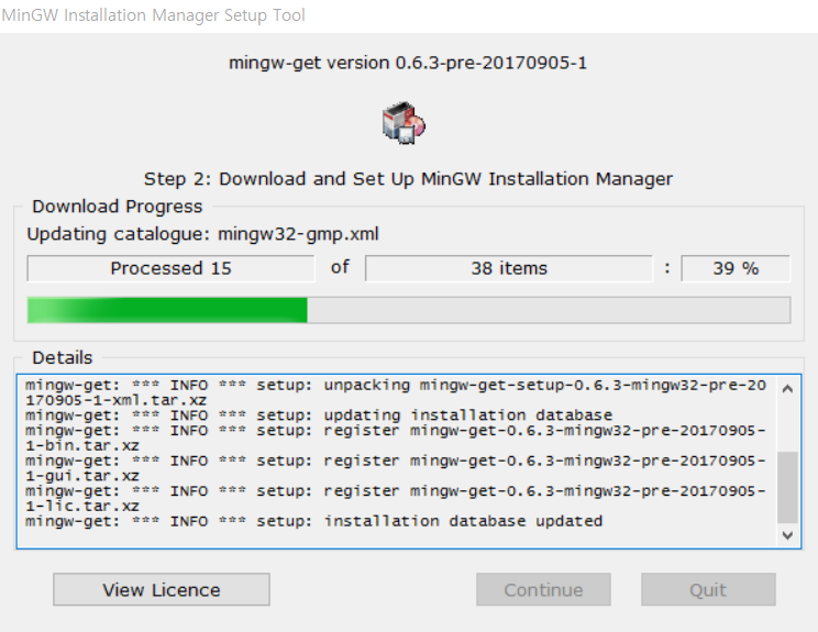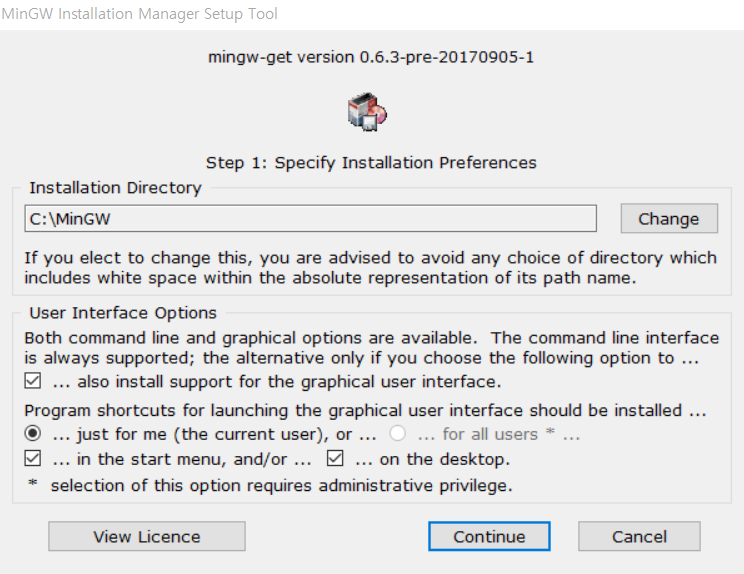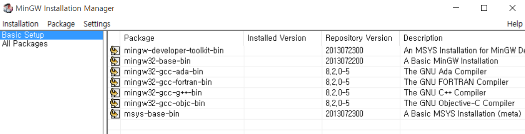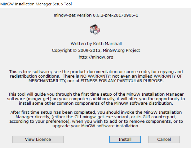 mingw-get-setup.exe 파일을 다운로드 받아서 설치를 진행하면 된다.