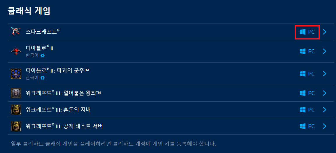 설치하실 때는 [클래식 게임] - [스타크래프트] - [PC]를 눌러서 설치 프로그램을 다운로드 받아줍니다.