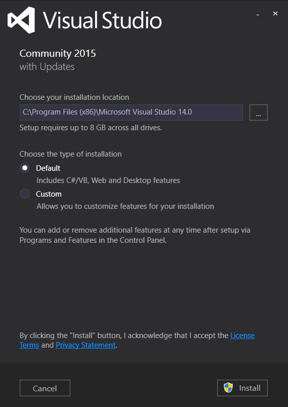 이후에 Visual Studio를 설치할 경로를 설정할 수 있다. 저자는 기본 설정(Default)으로 설치를 진행했다.