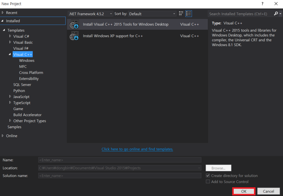 [New Project]에서 [Visual C++]로 하나의 프로젝트를 만들어 볼 수 있다. 기본적으로 C++ 개발 도구(Tools)가 설치되어 있지 않다면, C++ 개발 도구를 설치하라는 화면이 나온다.