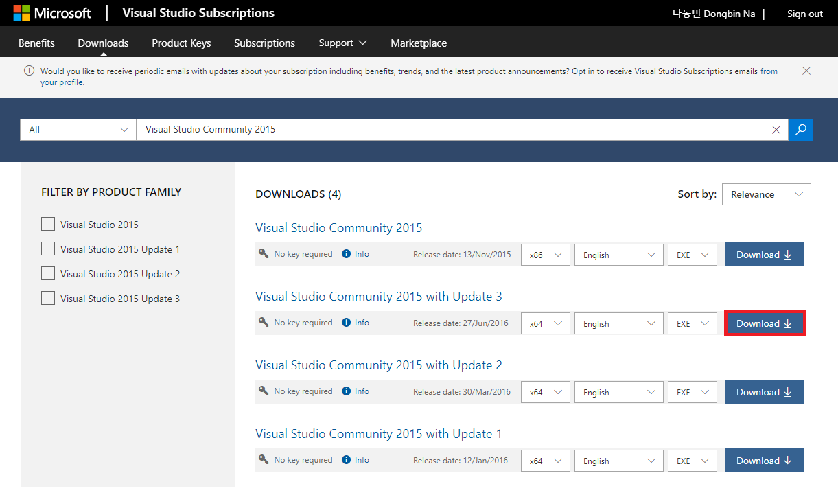 위 사이트에 접속하면, 아래와 같이 모든 제품군을 검색하여 설치할 수 있다. Visual Studio Community 2015를 검색한 뒤에 원하는 업데이트 버전을 골라 설치할 수 있다.