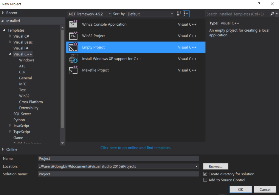 C++ 개발 도구가 설치된 이후에 [Empty Project]로 새로운 프로젝트를 생성할 수 있다.