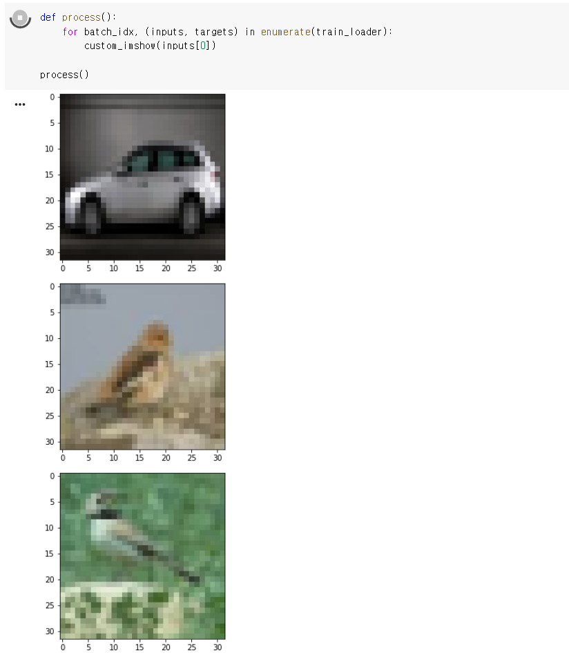 그럼 이제 이렇게 정의된 imshow() 함수를 이용하여 데이터셋의 이미지를 배치당 하나씩 출력해보자.
