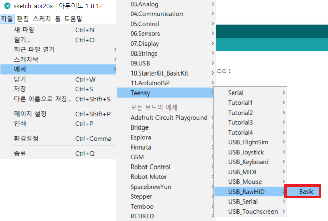 기본적인 Raw HID 소스코드는 [예제] - [Teensy] - [USB Raw HID] - [Basic]으로 가면 됩니다.