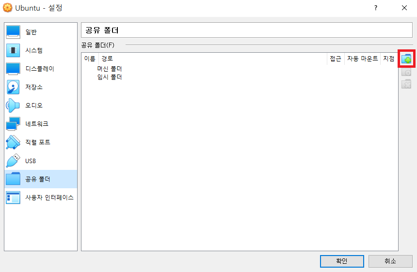 [공유 폴더] 설정을 할 때, 처음에는 다음과 같이 내용이 비어있을 겁니다. 오른쪽 위의 [+] 버튼을 눌러서 추가를 진행하시면 됩니다.