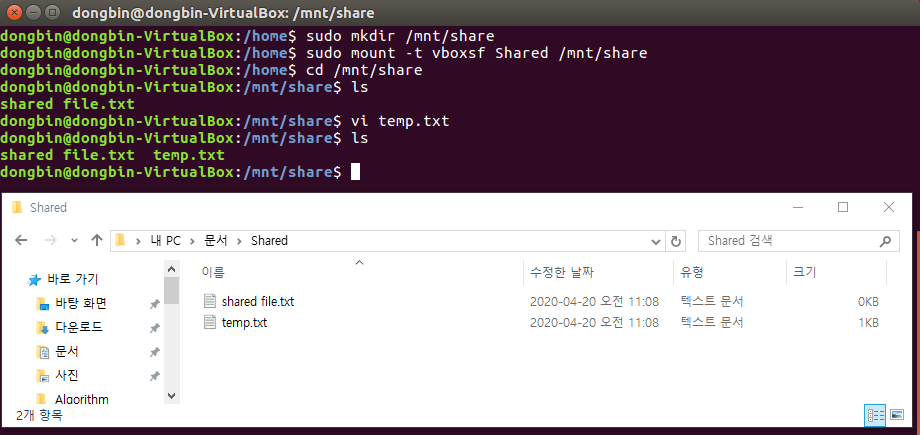 명령을 수행한 뒤에는 두 OS가 성공적으로 폴더를 공유하고 있는 것을 확인할 수 있습니다.