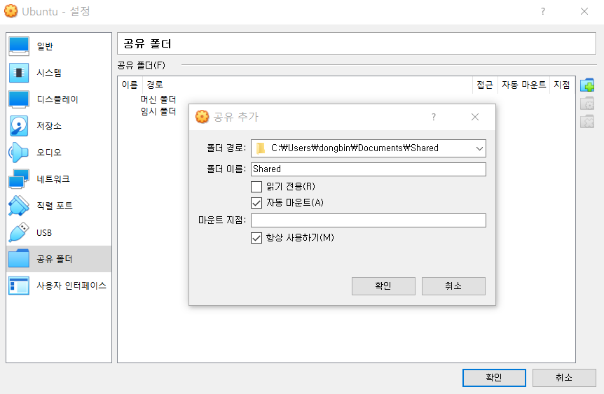 이 때 호스트(Host) OS에서 공유 폴더 전용으로 하나의 폴더를 생성해 주시고, 이를 [폴더 경로]에 넣어줍시다. 이렇게 해서 [확인] 버튼을 눌러 만들어 주겠습니다.