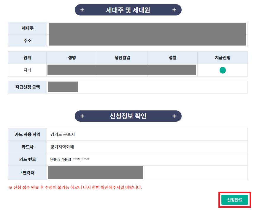 조회가 완료되면 다음과 같이 최종적으로 [신청 완료]를 진행하실 수 있습니다.