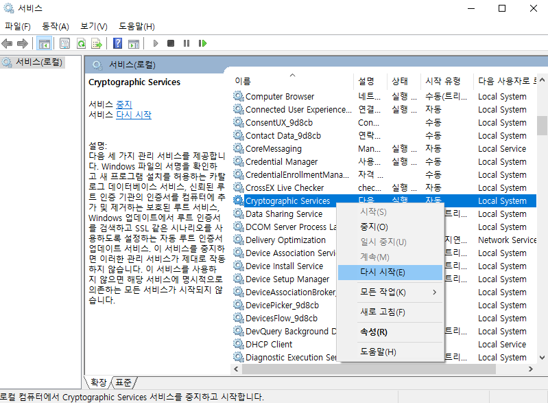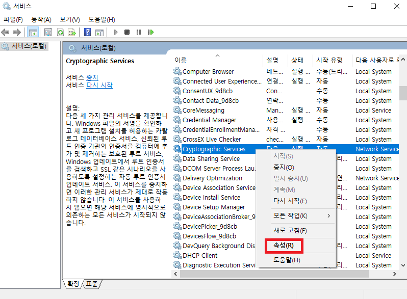 서비스(Services) 창이 켜지면 [Cryptographic Services]를 찾아서 우클릭하여 [속성(R)] 창을 열어준다.