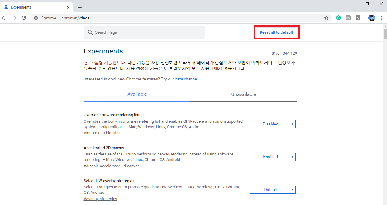 크롬(Chrome)은 chrome://flags 경로로 들어가면, 실험적인 기능에 대한 사용 여부를 설정할 수 있다.