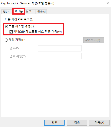이 때 [로그온] 탭으로 이동하여 [로컬 시스템 계정]란에서 [서비스와 데스크톱 상호 작용 허용]을 눌러주면 된다.