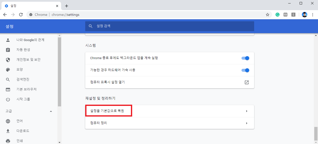 이제 [설정을 기본값으로 복원]을 눌러서 모든 설정 값을 기본 설정으로 변경하자.