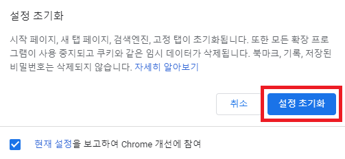 다음과 같이 [설정 초기화]를 눌러서 초기화를 진행하면 된다.