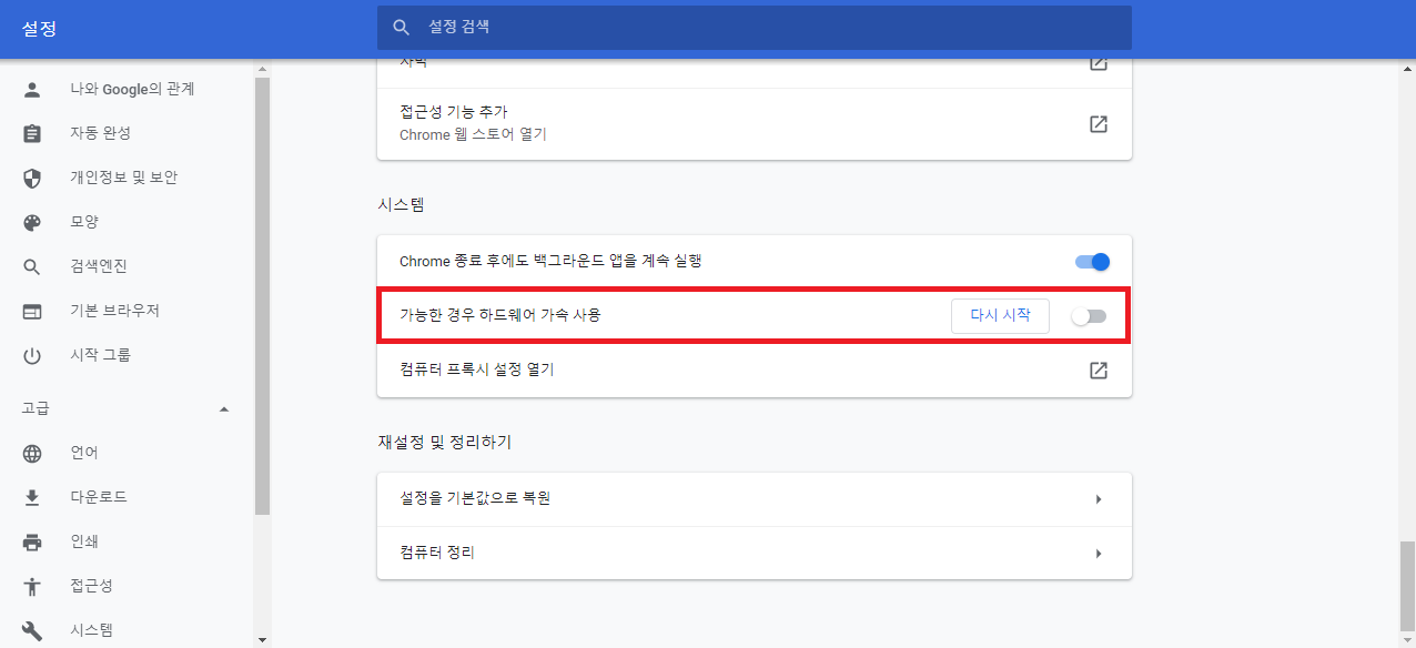 또한 [가능한 경우 하드웨어 가속 사용] 기능을 꺼준다.