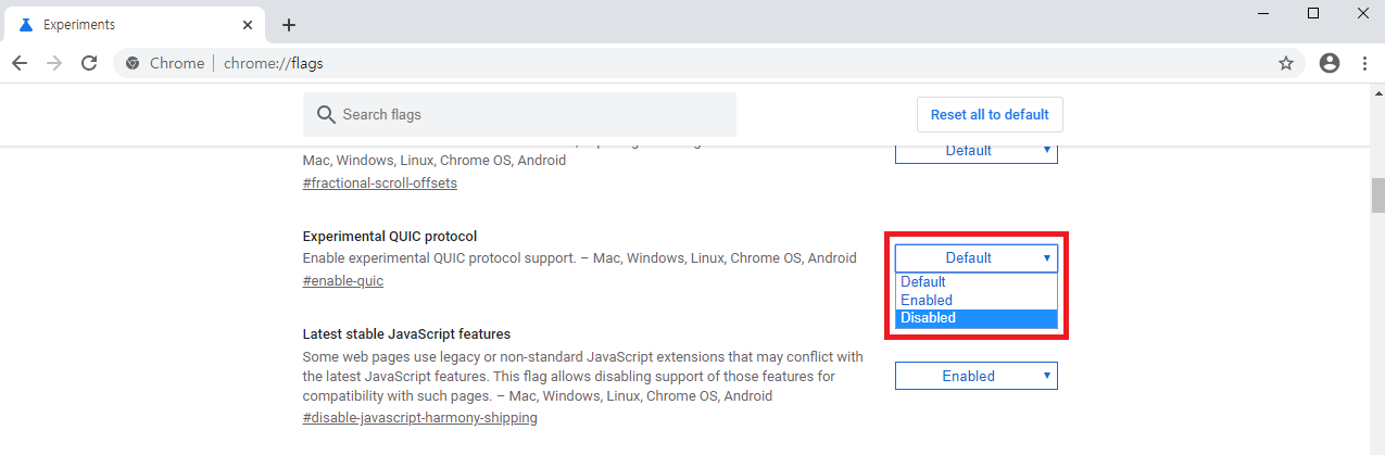 이후에 Experimental QUIC protocol 기능을 [Disabled]로 설정하자.