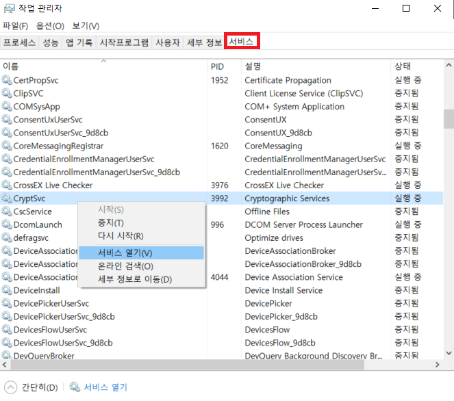 다음과 같이 작업 관리자를 실행한 뒤에, [서비스] 탭으로 이동하여 [Cryptographic Services]가 존재하는지 확인한다. 존재한다면, 우클릭 이후에 [서비스 열기]를 눌러서 서비스 창을 열 수 있다.