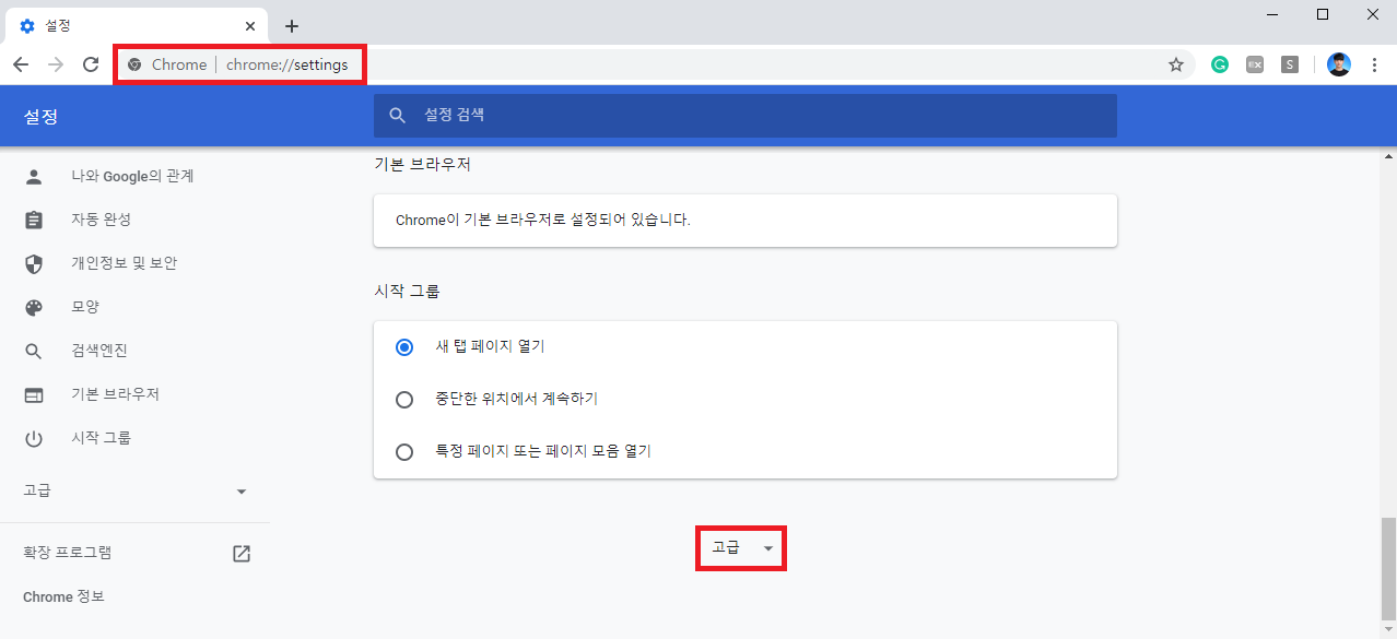 또한 크롬(Chrome) 브라우저에서는 chrome://settings 경로로 이동하여 브라우저 [설정] 창으로 이동할 수 있다.