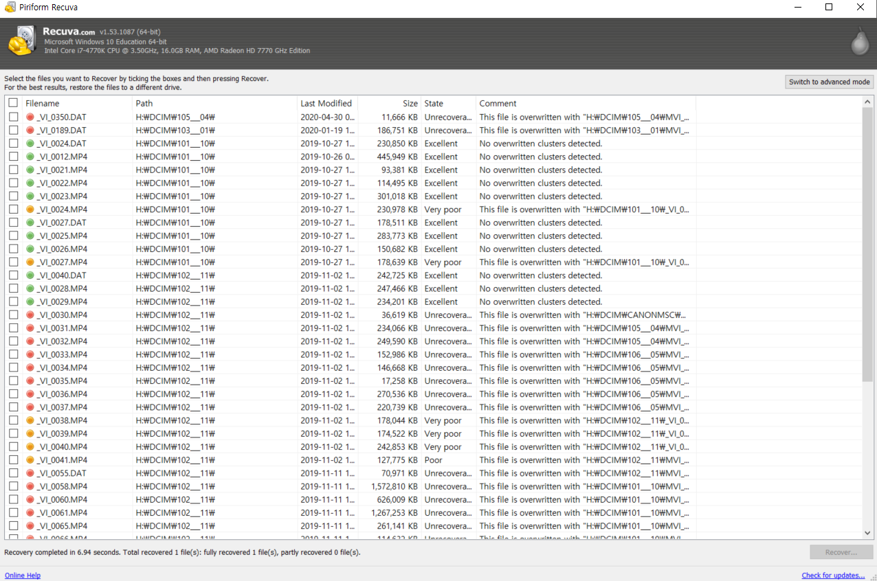 스캔이 끝나고 나면, 다음과 같이 복구할 수 있는 파일들의 리스트가 등장한다. 다만, 필자의 경우에는 삭제했던 파일들은 복구가 가능한 경우가 많았지만, 갑자기 사라져 버린 파일들에 대해서는 레쿠바(Recuva)가 찾지 못했다. 아마 삭제 자체를 하지는 않았기에, SD 카드에 그대로 남아 있는 영역이라서 레쿠바가 찾지 못하는 것 같다.