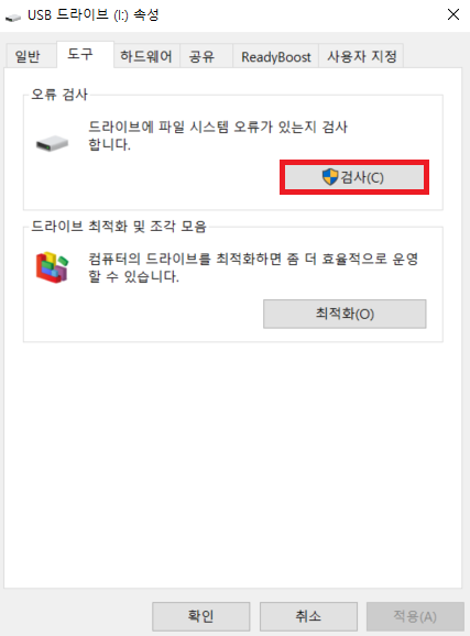 나는 드라이브에 오류가 없다고 나왔지만, 그래도 [드라이브 검사 및 복구] 버튼을 눌렀다.