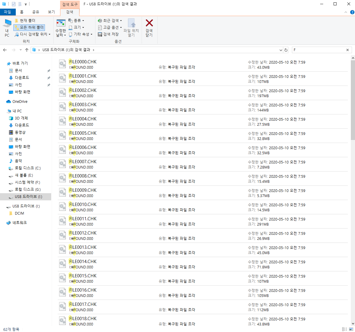 속은셈 치고, USB 드라이브의 루트 폴더에서 'FILE'이라고 검색해보았다. 그랬더니 FOUND.000 폴더는 안 보이지만, 그 안에 있는 파일들은 보이게 되었다!