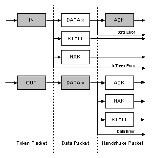 2) 데이터 단계(Data Stage): 데이터 단계는 필요하다면 존재할 수 있다. 만약 데이터 단계가 있다면, 설정 단계에서 '데이터 단계에서 얼마나 많은 패킷이 전달될 지' 미리 설정이 된다. 데이터 단계는 다수의 IN 토큰 (호스트가 데이터를 받는 경우)과 OUT 토큰 (호스트가 데이터를 보내는 경우)으로 구성되는 경우가 많다.