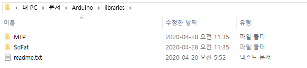 이제 해당 경로에 다음과 같이 MTP 라이브러리, SdFat 라이브러리 폴더를 놓아 두었다. 각 라이브러리 폴더에는 규격에 맞게 라이브러리의 내용이 구현되어 있다.