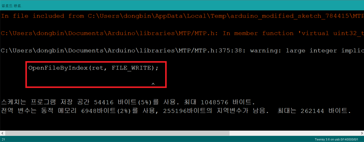 우리가 추가한 MTP.h 라이브러리 파일에서 OpenFileByIndex 함수 부분의 uint8_t mode = O_RDONLY를 oflag_t mode = O_RDONLY로 변경하면 경고 메시지가 사라진다.