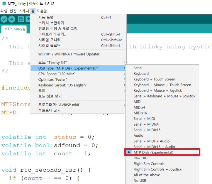 ※ Teensyduino에서 MTP Disk 타입 설정 ※