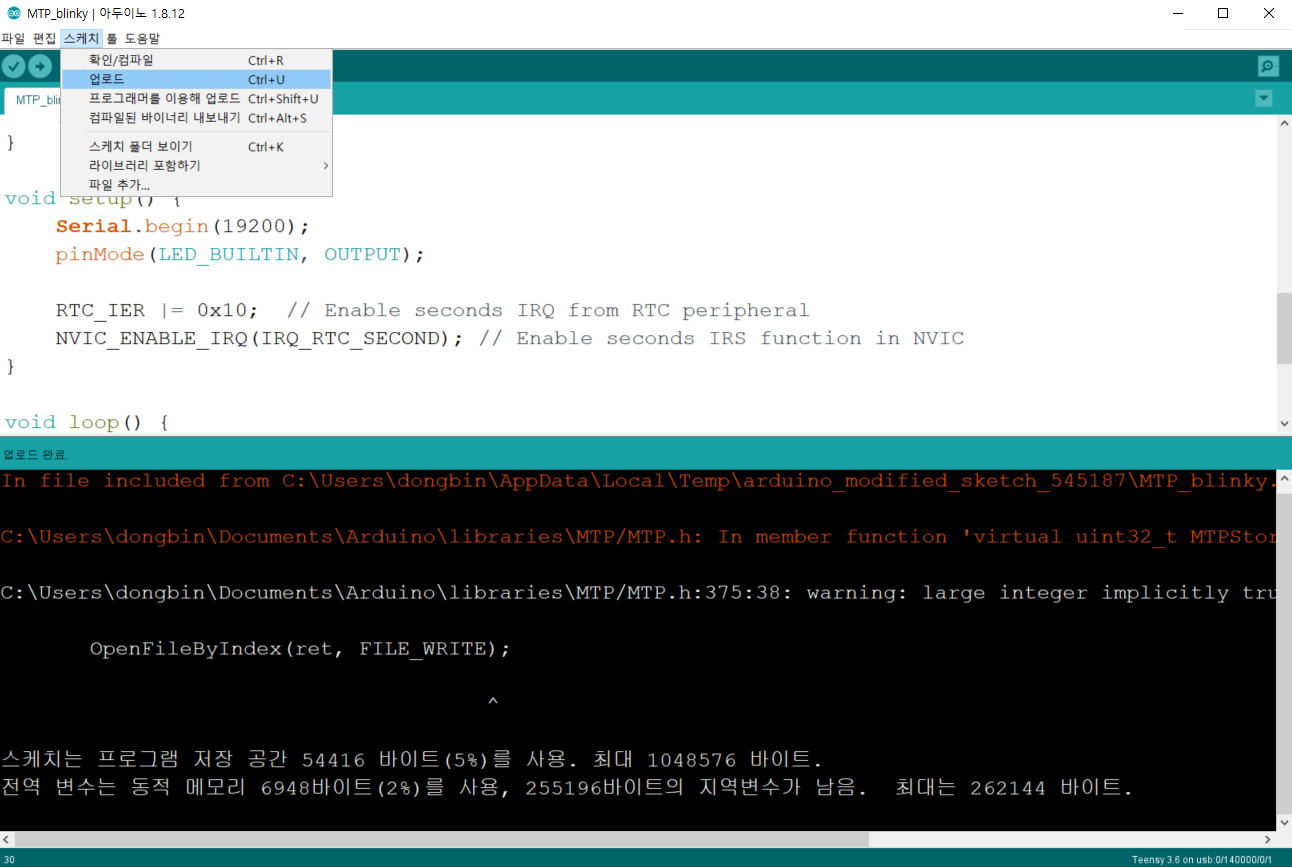 다음과 같이 [스케치] - [업로드]를 눌러서 업로드를 진행할 수 있다. 업로드를 진행하면 경고 메시지가 나올 수 있지만, 다음과 같이 정상적으로 Teensy 프로그램이 업로드된다.