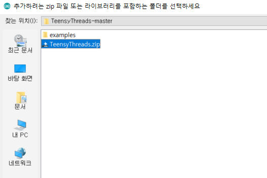 여기에서 TeensyThreads를 선택하여 TeensyThread 라이브러리를 불러 올 수 있다.