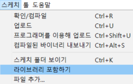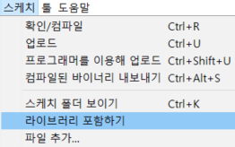 압축 파일(zip)을 라이브러리로 포함시킬 때에도 마찬가지로 [스케치] - [라이브러리 포함하기]로 이동하면 된다.