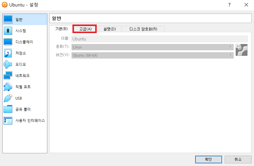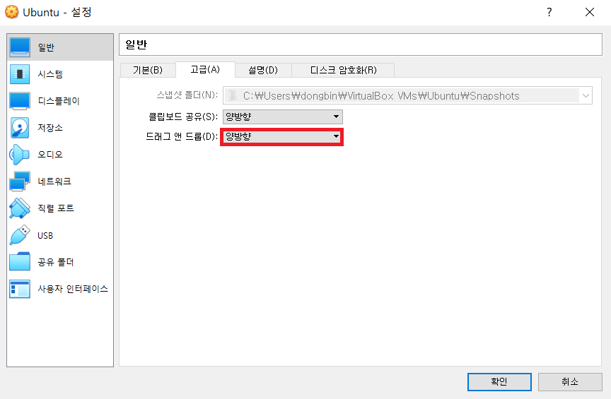 Oracle VM VirtualBox를 이용할 때는 드래그 앤 드롭(Drag And Drop)으로 간단하게 Host와 Guest 사이에 파일을 주고 받을 수 있습니다. 이를 설정하는 방법은 간단한데요. 먼저 Oracle VM VirtualBox에서 [머신] - [설정]으로 이동합니다. 그리고 [일반] - [고급] 탭으로 이동해주세요.