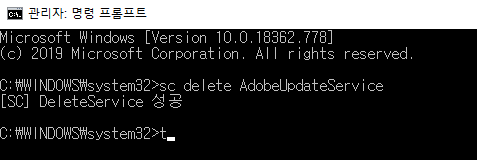 참고로 해당 AdobeUpdateService를 완전히 제거하고 싶으시다면 다음과 같이 명령 프롬프트(CMD)를 관리자 권한으로 실행하신 뒤에 sc delete 명령어를 이용하시면 됩니다.