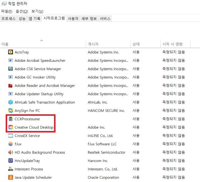 또한 컴퓨터가 부팅되었을 때 자동으로 Creative Cloud 앱이 실행되지 않도록, 작업 관리자를 실행하여 다음의 두 프로그램을 사용하지 않도록 해주시면 됩니다.