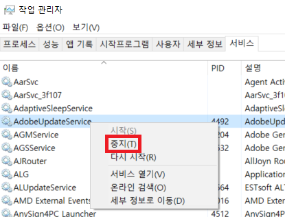 또한 어도비는 컴퓨터가 부팅될 때 자동 업데이트 프로그램을 실행합니다. 이것도 방지하고 싶다면 [작업 관리자]의 [서비스] 탭에서 AdobeUpdateService를 찾아서 [중지]를 적용해주시면 됩니다.