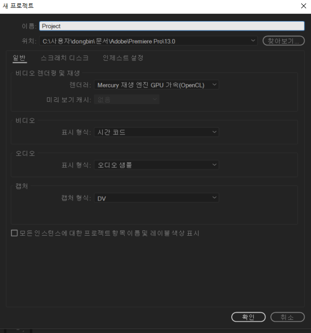 어도비 프리미어를 실행하면 다음과 같이 하나의 [새 프로젝트]를 만드실 수 있습니다.