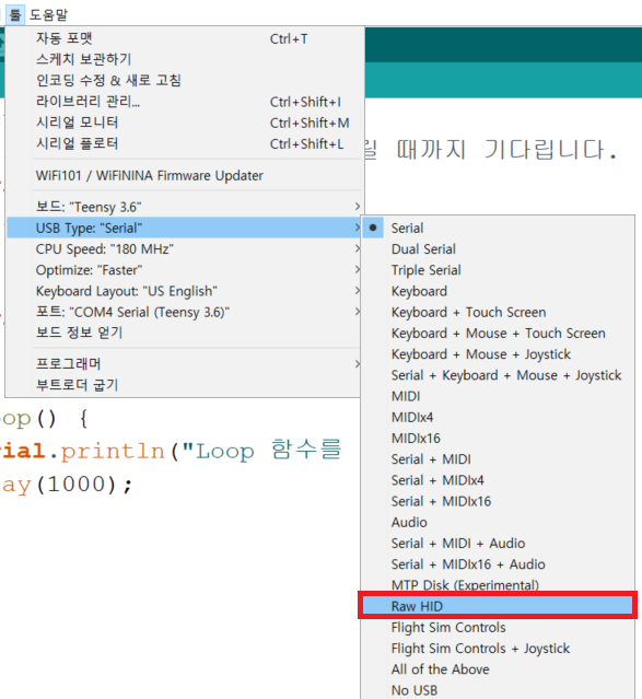 Teensy에서는 기본적으로 Serial 통신을 이용할 때 Serial을 포함하는 USB Type을 설정했는지 확인할 필요가 있습니다. 만약에 RawHID와 Serial 통신을 같이 사용해야 할 때에는 RawHID를 선택할 수 있는데요. 다만 RawHID는 기본적으로 Serial 통신을 메인으로 사용하지 않으며, setup() 함수에 포함되어 있는 Serial 작업은 무시될 수 있습니다. 이 점을 유의하셔야 합니다.